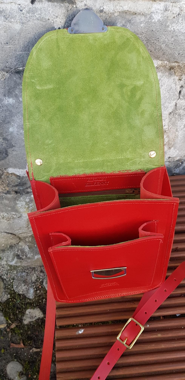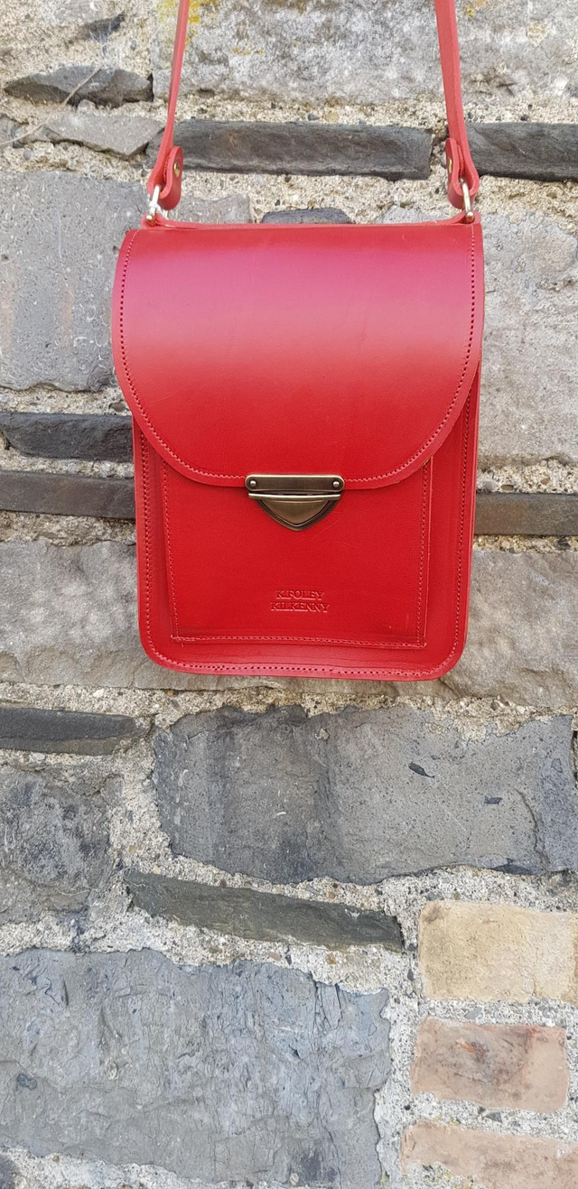 Cross body shoulder bag, medium sized bag made from veg tanned leather. Exterior zipped pocket for phone, fully lined leather interior. Other features include adjustable shoulder strap with brass fittings.